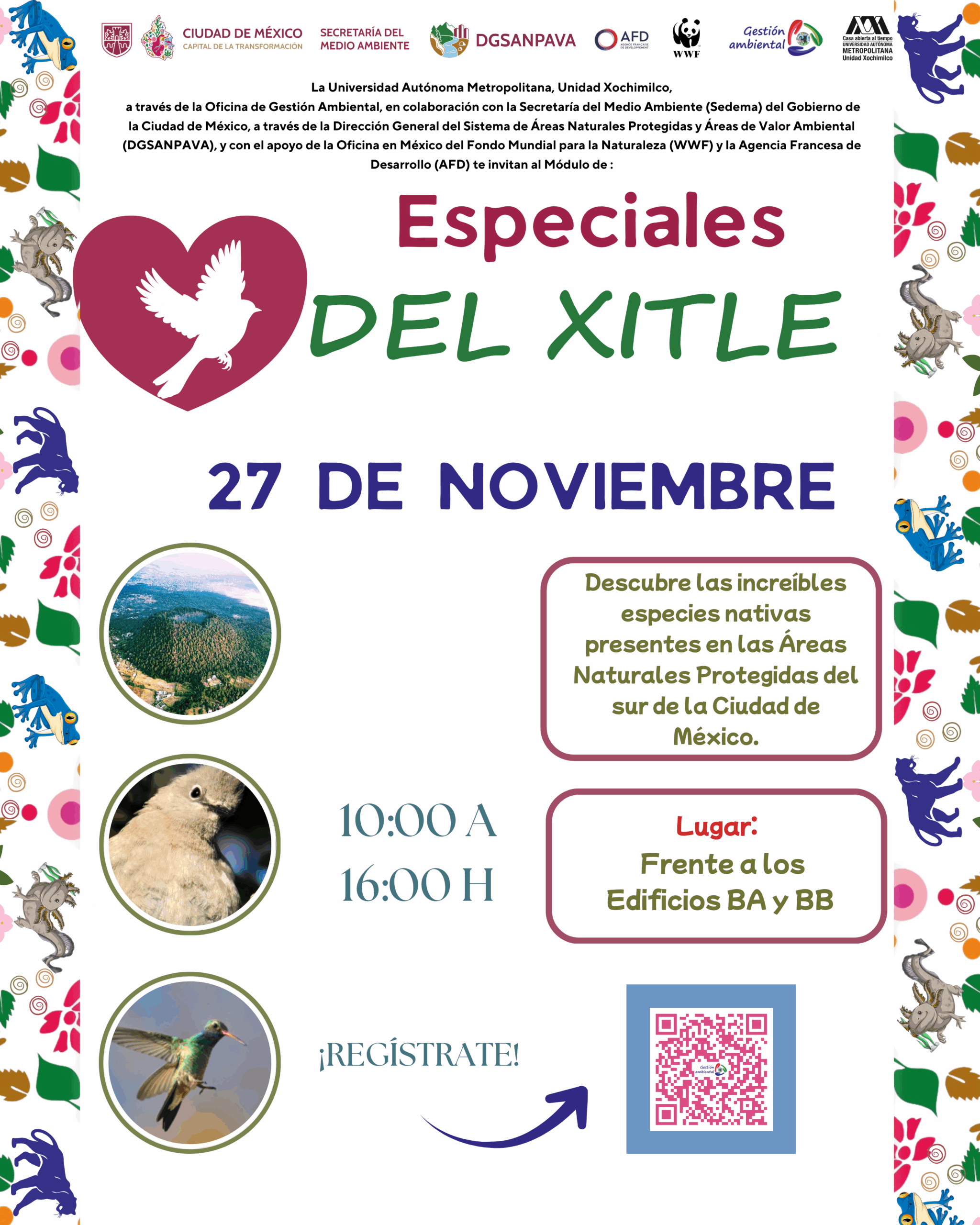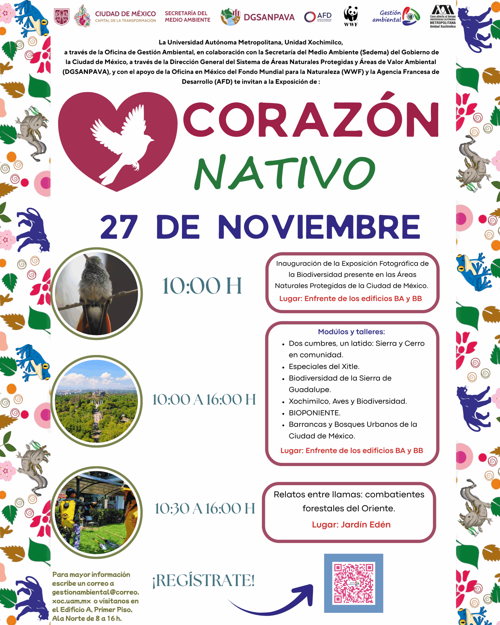 La Universidad Autónoma Metropolitana, Unidad Xochimilco, a través de la Oficina de Gestión Ambiental, en colaboración con la Secretaría del Medio Ambiente (Sedema) del Gobierno de la Ciudad de México, a través de la Dirección General del Sistema de Áreas Naturales Protegidas y Áreas de Valor Ambiental (DGSANPAVA), y con el apoyo de la Oficina en México del Fondo Mundial para la Naturaleza (WWF) y la Agencia Francesa de Desarrollo (AFD) te invitan a participar en la Exposición de Corazón Nativo.