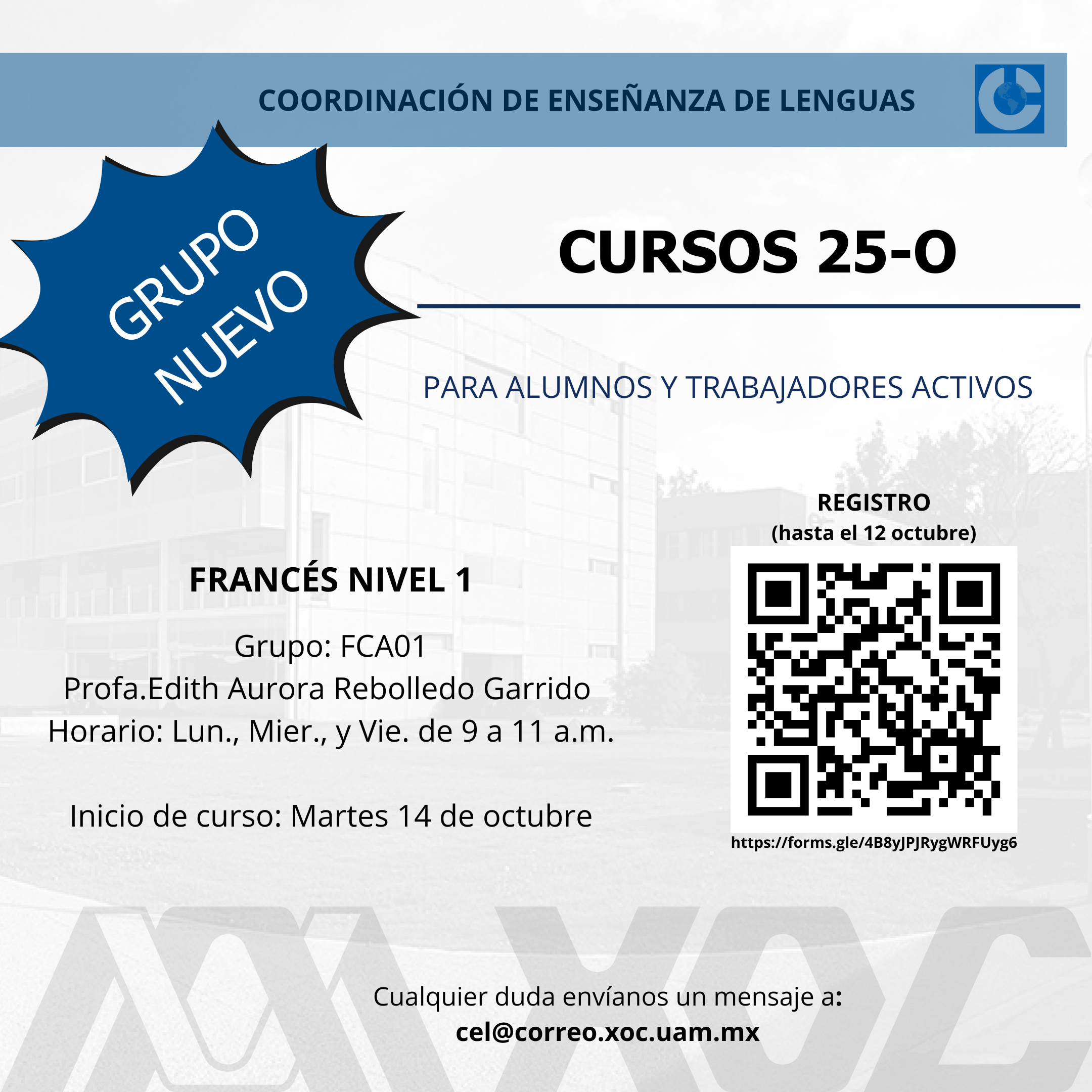 Cursos de francés nivel 1 para alumnos y trabajadores activos 📌Pre-registro https://forms.gle/HEZ8G6iC88YoZ95k8 📢hasta el 12 de octubre 📆Inicio de curso: martes 14 de octubre 📧cel@correo.xoc.uam.mx + Añadir Google Calendar Exportación + iCal / Outlook Etiquetas: curso, Francés Fecha Oct 09 - 12 2025 Finalizdo! Categorías Cursos Organizador Coordinación de Enseñanza de Lenguas Compartir este evento