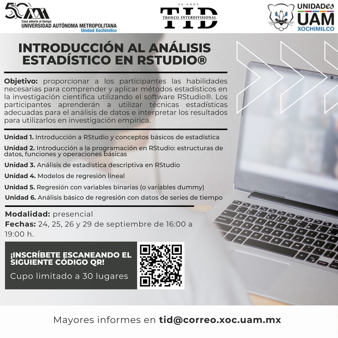 El curso tiene como objetivo proporcionar a los participantes las habilidades necesarias para comprender y aplicar métodos estadísticos en la investigación científica utilizando el software RStudio®. Los participantes aprenderán a utilizar técnicas estadísticas adecuadas para el análisis de datos e interpretar los resultados para utilizarlos en investigación empírica.