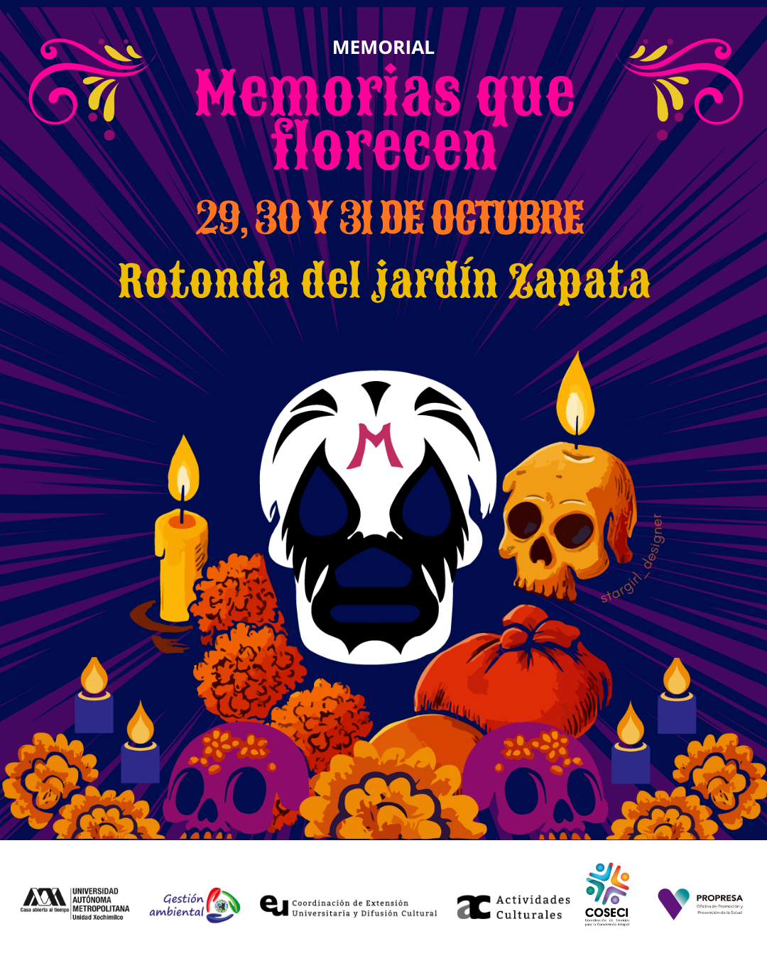 Participantes: Toda la comunidad universitaria puede participar escribiendo dedicatorias a sus seres queridos fallecidos y colocándolas en elementos tradicionales de la ofrenda (flores, velas o calaveritas impresas) en la estructura colectiva del memorial.