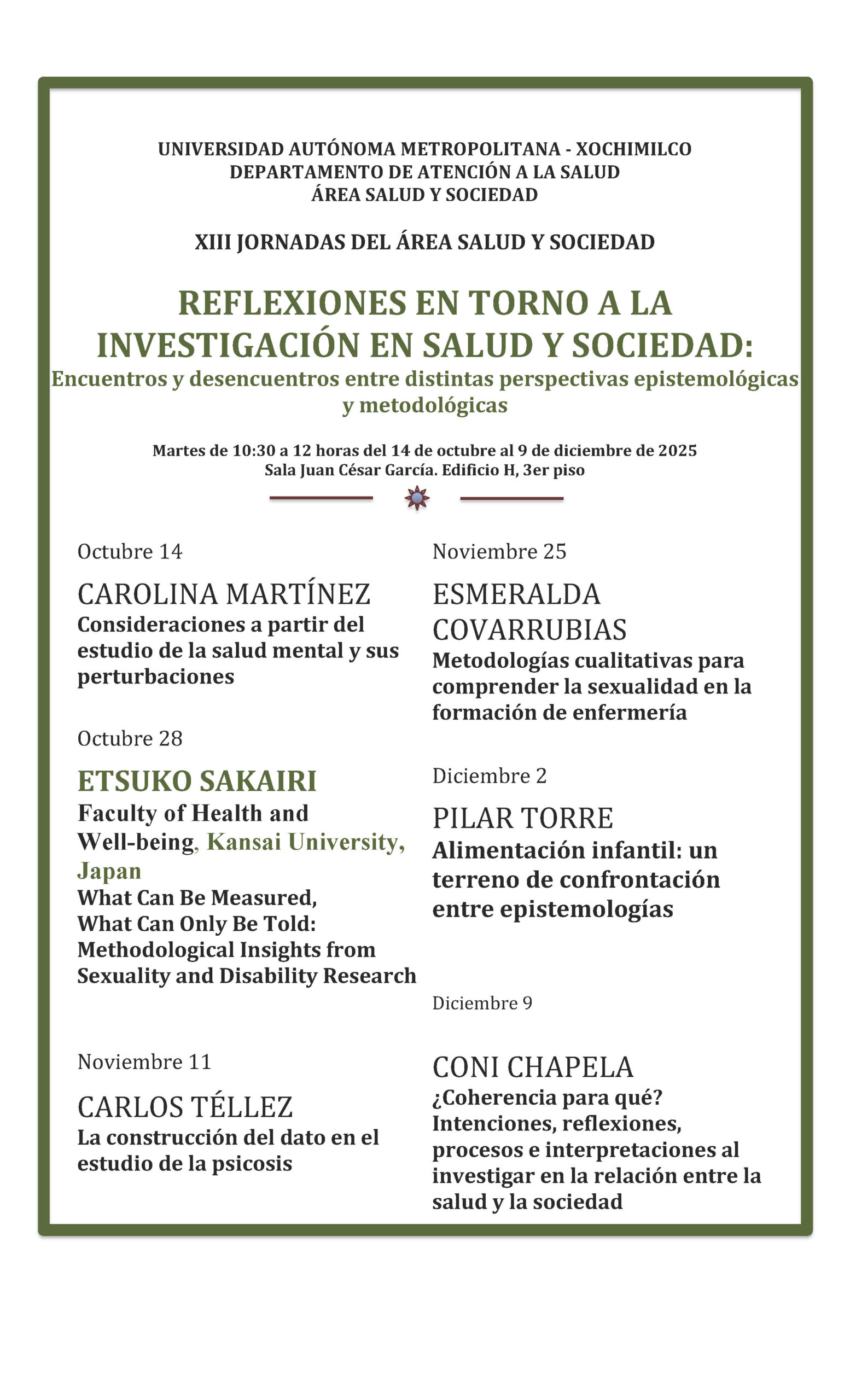 Las presentaciones a cargo de los integrantes del Área y una profesora invitada incluirán: consideraciones a partir del estudio de la salud mental y sus perturbaciones; perspectivas metodológicas desde la investigación en sexualidad y discapacidad; la construcción del dato en el estudio de la psicosis; metodologías cualitativas para comprender la sexualidad en la formación de enfermería; alimentación infantil como terreno de confrontaciones epistemológicas, e intenciones, reflexiones, procesos e interpretaciones al investigar la relación entre salud y sociedad.